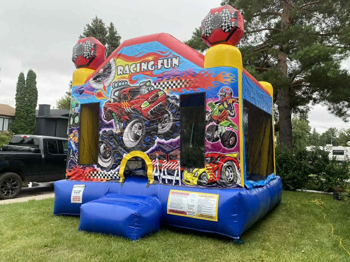 Racing fun inflatable bouncy castle set up for rental in Saskatoon