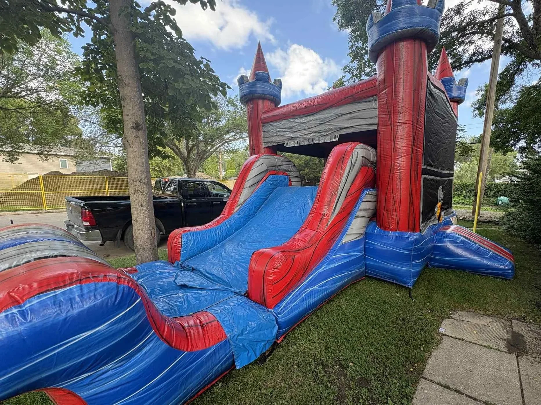 Majestic fun meets refreshing splash with this castle-themed combo. Allow your child to be the ruler of their own castle with this majestic castle! Dry sliding in cooler months, wet for summer.